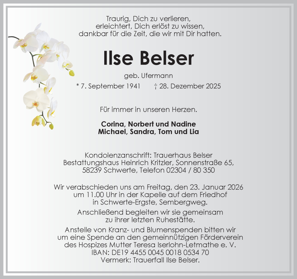 Hier finden Sie alle Traueranzeigen aus der Zeitung, die bisher für Ilse Belser erschienen sind. Weitere Traueranzeigen, die in der Zeitung erscheinen, werden hier ebenfalls aufgelistet