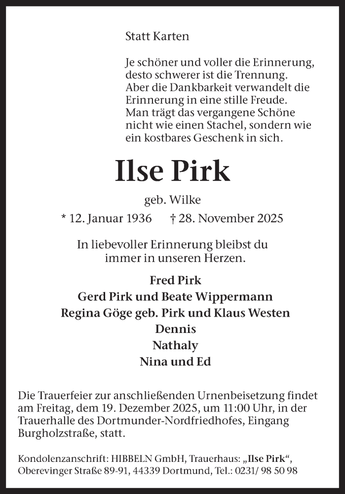 Hier finden Sie alle Traueranzeigen aus der Zeitung, die bisher für Ilse Pirk erschienen sind. Weitere Traueranzeigen, die in der Zeitung erscheinen, werden hier ebenfalls aufgelistet