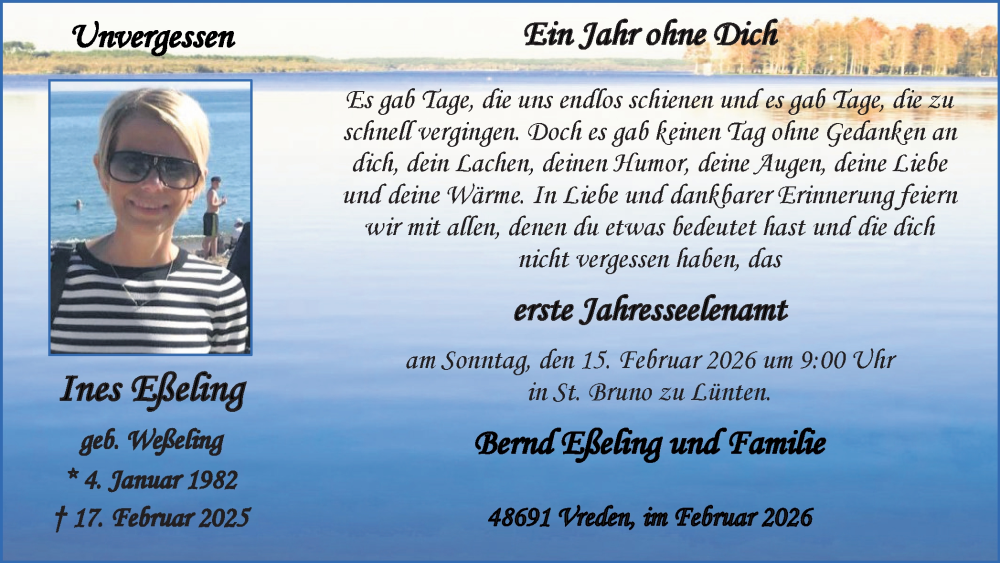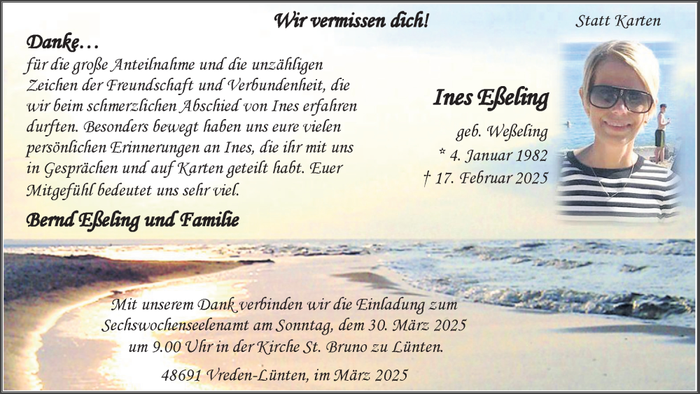Hier finden Sie alle Traueranzeigen aus der Zeitung, die bisher für Ines Eßeling erschienen sind. Weitere Traueranzeigen, die in der Zeitung erscheinen, werden hier ebenfalls aufgelistet