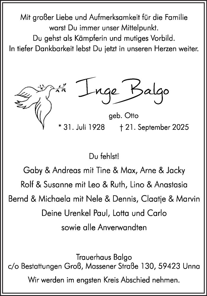 Hier finden Sie alle Traueranzeigen aus der Zeitung, die bisher für Inge Balgo erschienen sind. Weitere Traueranzeigen, die in der Zeitung erscheinen, werden hier ebenfalls aufgelistet