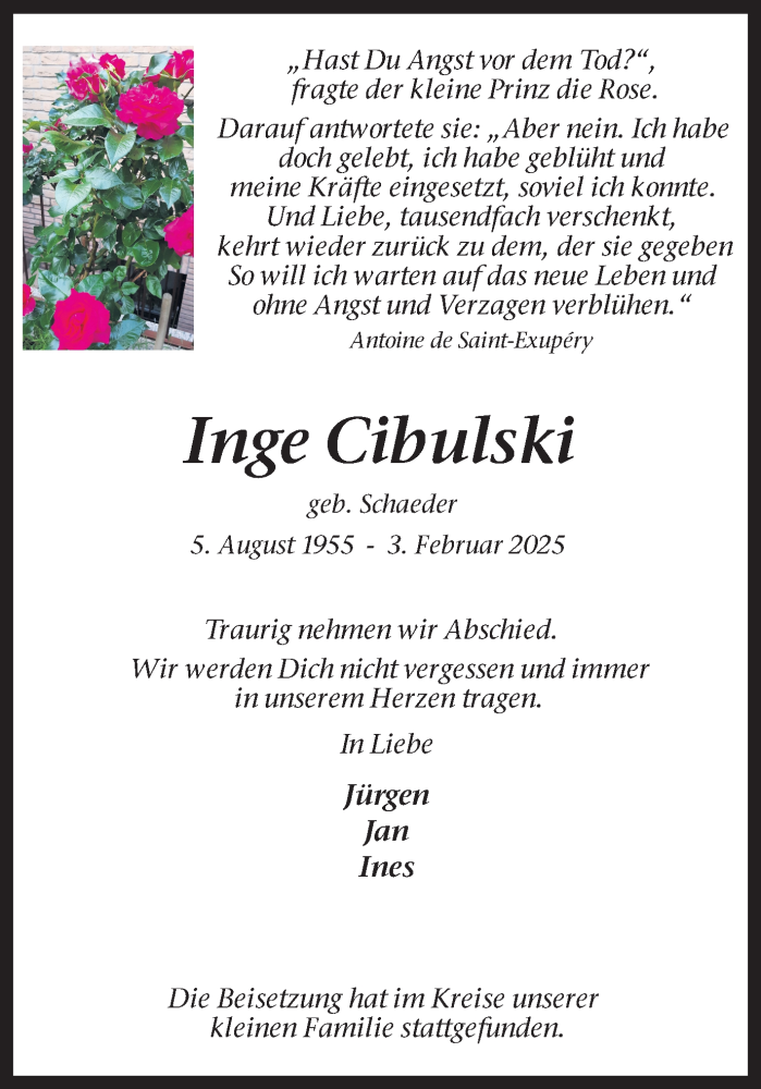 Hier finden Sie alle Traueranzeigen aus der Zeitung, die bisher für Inge Cibulski erschienen sind. Weitere Traueranzeigen, die in der Zeitung erscheinen, werden hier ebenfalls aufgelistet