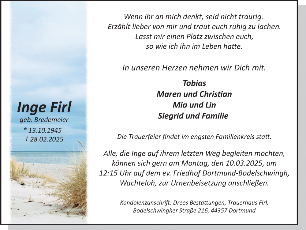 Hier finden Sie alle Traueranzeigen aus der Zeitung, die bisher für Inge Firl erschienen sind. Weitere Traueranzeigen, die in der Zeitung erscheinen, werden hier ebenfalls aufgelistet