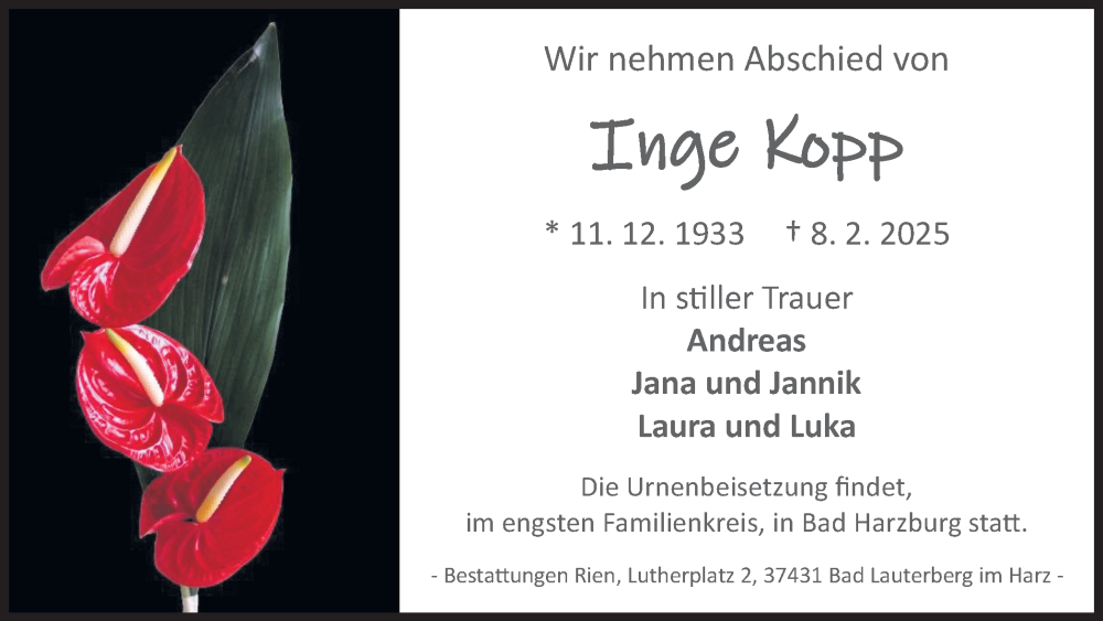 Hier finden Sie alle Traueranzeigen aus der Zeitung, die bisher für Inge Kopp erschienen sind. Weitere Traueranzeigen, die in der Zeitung erscheinen, werden hier ebenfalls aufgelistet