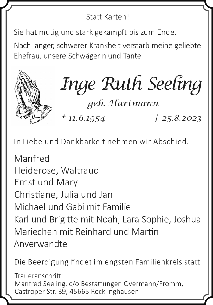 Hier finden Sie alle Traueranzeigen aus der Zeitung, die bisher für Inge Ruth Seeling erschienen sind. Weitere Traueranzeigen, die in der Zeitung erscheinen, werden hier ebenfalls aufgelistet