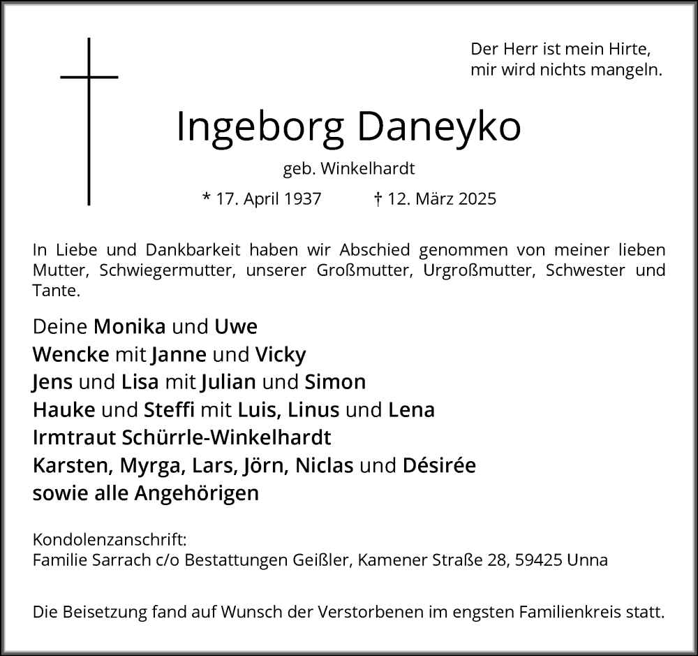 Hier finden Sie alle Traueranzeigen aus der Zeitung, die bisher für Ingeborg Daneyko erschienen sind. Weitere Traueranzeigen, die in der Zeitung erscheinen, werden hier ebenfalls aufgelistet