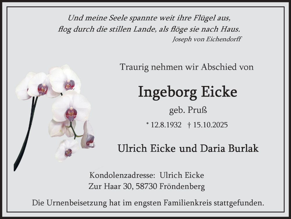 Hier finden Sie alle Traueranzeigen aus der Zeitung, die bisher für Ingeborg Eicke erschienen sind. Weitere Traueranzeigen, die in der Zeitung erscheinen, werden hier ebenfalls aufgelistet