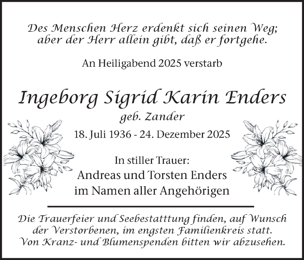 Hier finden Sie alle Traueranzeigen aus der Zeitung, die bisher für Ingeborg Sigrid Karin Enders erschienen sind. Weitere Traueranzeigen, die in der Zeitung erscheinen, werden hier ebenfalls aufgelistet