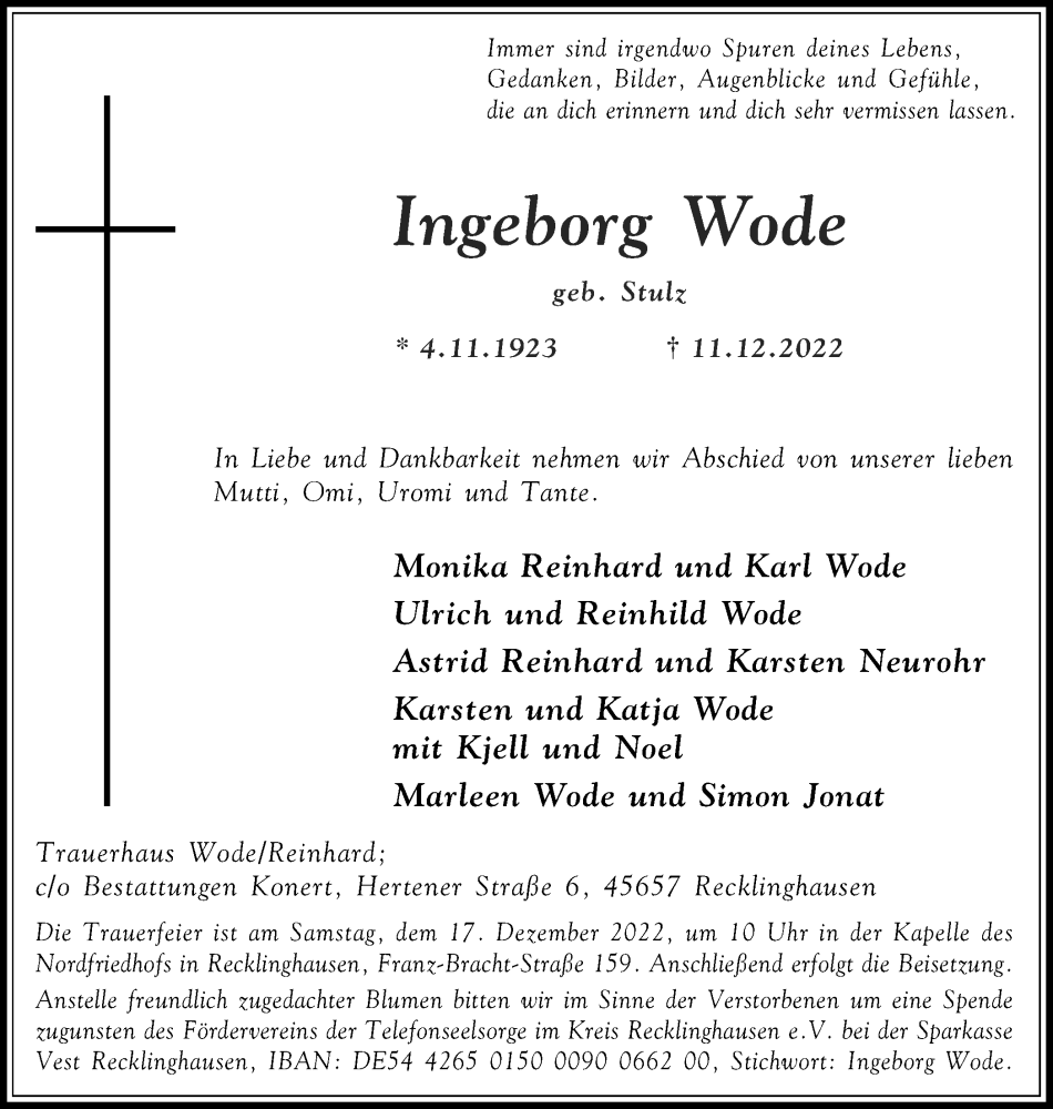 Hier finden Sie alle Traueranzeigen aus der Zeitung, die bisher für Ingeborg Wode erschienen sind. Weitere Traueranzeigen, die in der Zeitung erscheinen, werden hier ebenfalls aufgelistet