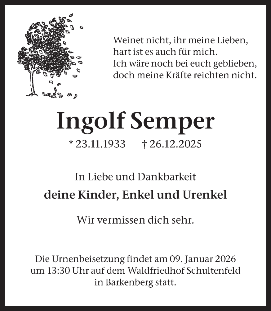 Hier finden Sie alle Traueranzeigen aus der Zeitung, die bisher für Ingolf Semper erschienen sind. Weitere Traueranzeigen, die in der Zeitung erscheinen, werden hier ebenfalls aufgelistet