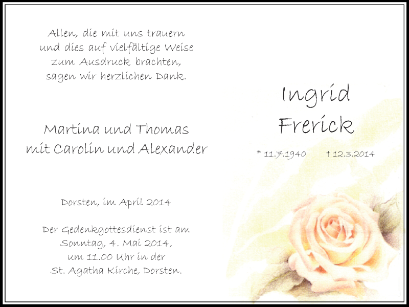 Hier finden Sie alle Traueranzeigen aus der Zeitung, die bisher für Ingrid Frerick erschienen sind. Weitere Traueranzeigen, die in der Zeitung erscheinen, werden hier ebenfalls aufgelistet