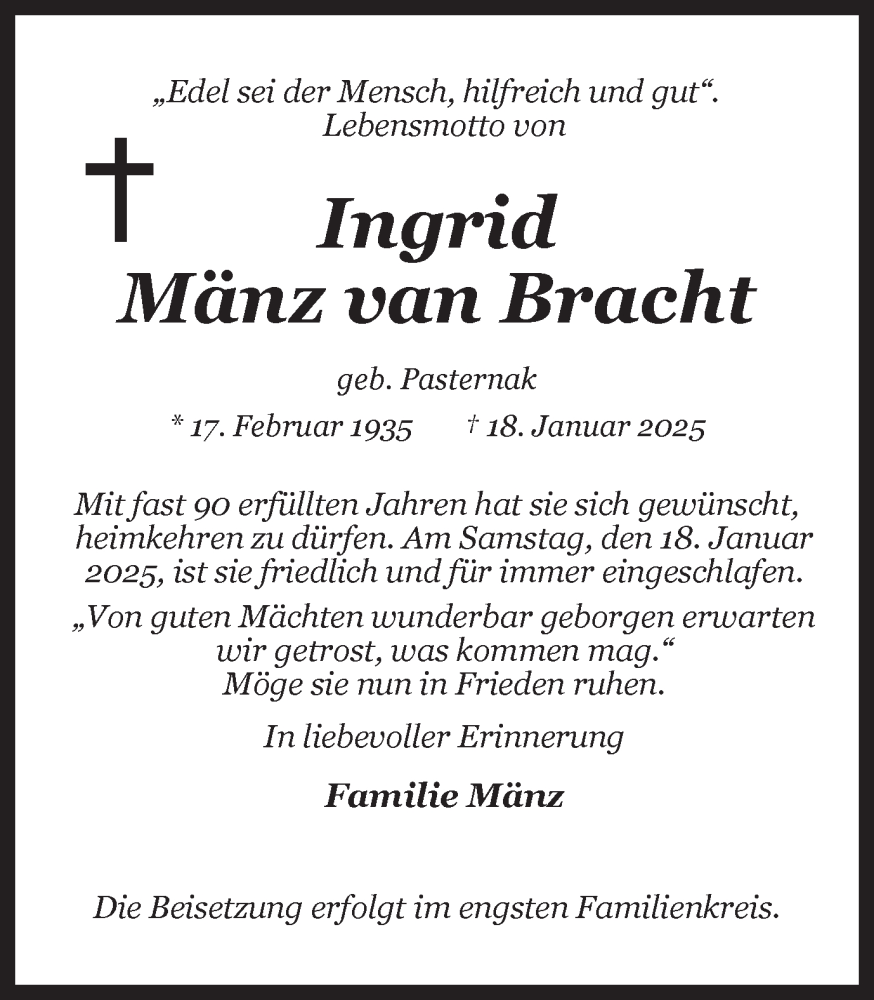 Hier finden Sie alle Traueranzeigen aus der Zeitung, die bisher für Ingrid Mänz van Bracht erschienen sind. Weitere Traueranzeigen, die in der Zeitung erscheinen, werden hier ebenfalls aufgelistet