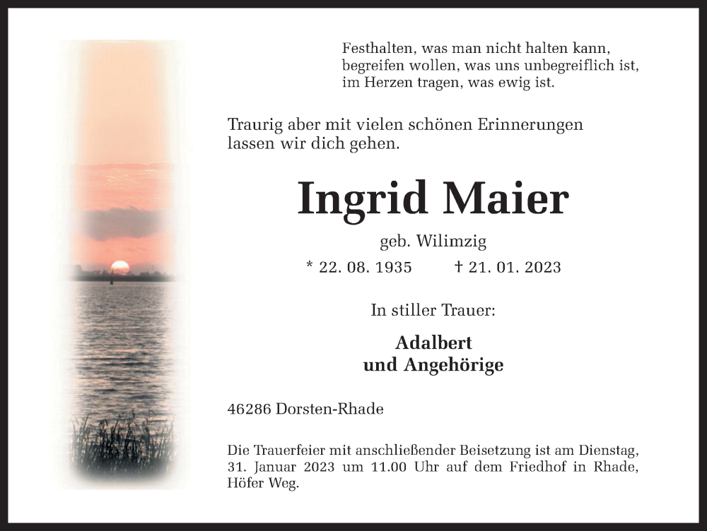 Hier finden Sie alle Traueranzeigen aus der Zeitung, die bisher für Ingrid Maier erschienen sind. Weitere Traueranzeigen, die in der Zeitung erscheinen, werden hier ebenfalls aufgelistet