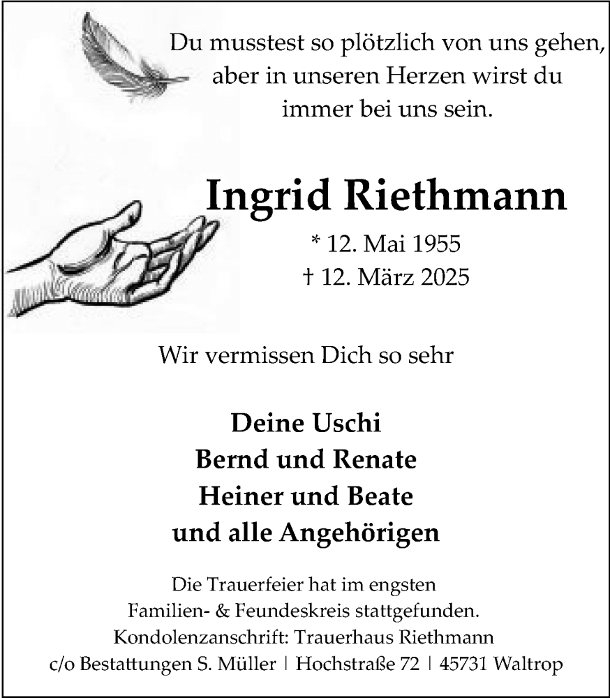 Hier finden Sie alle Traueranzeigen aus der Zeitung, die bisher für Ingrid Riethmann erschienen sind. Weitere Traueranzeigen, die in der Zeitung erscheinen, werden hier ebenfalls aufgelistet