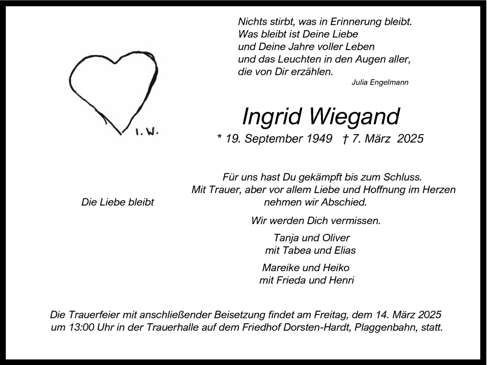 Hier finden Sie alle Traueranzeigen aus der Zeitung, die bisher für Ingrid Wiegand erschienen sind. Weitere Traueranzeigen, die in der Zeitung erscheinen, werden hier ebenfalls aufgelistet