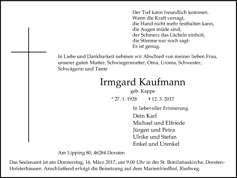 Hier finden Sie alle Traueranzeigen aus der Zeitung, die bisher für Irmgard Kaufmann erschienen sind. Weitere Traueranzeigen, die in der Zeitung erscheinen, werden hier ebenfalls aufgelistet