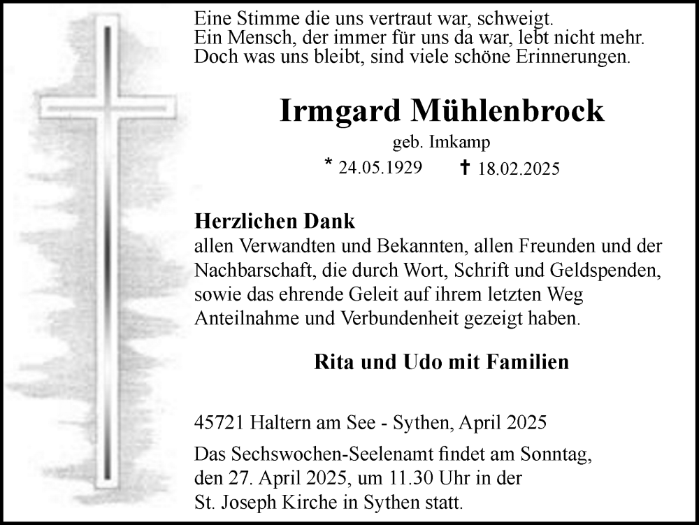 Hier finden Sie alle Traueranzeigen aus der Zeitung, die bisher für Irmgard Mühlenbrock erschienen sind. Weitere Traueranzeigen, die in der Zeitung erscheinen, werden hier ebenfalls aufgelistet