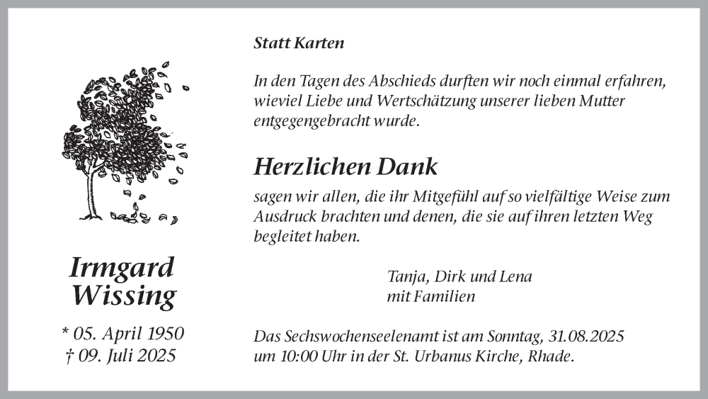 Hier finden Sie alle Traueranzeigen aus der Zeitung, die bisher für Irmgard Wissing erschienen sind. Weitere Traueranzeigen, die in der Zeitung erscheinen, werden hier ebenfalls aufgelistet