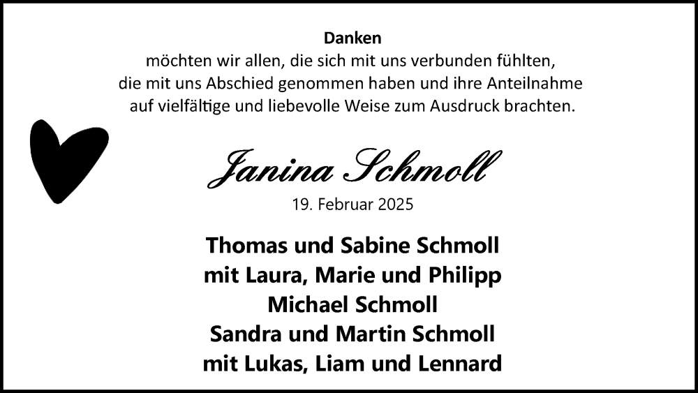 Hier finden Sie alle Traueranzeigen aus der Zeitung, die bisher für Janina Schmoll erschienen sind. Weitere Traueranzeigen, die in der Zeitung erscheinen, werden hier ebenfalls aufgelistet