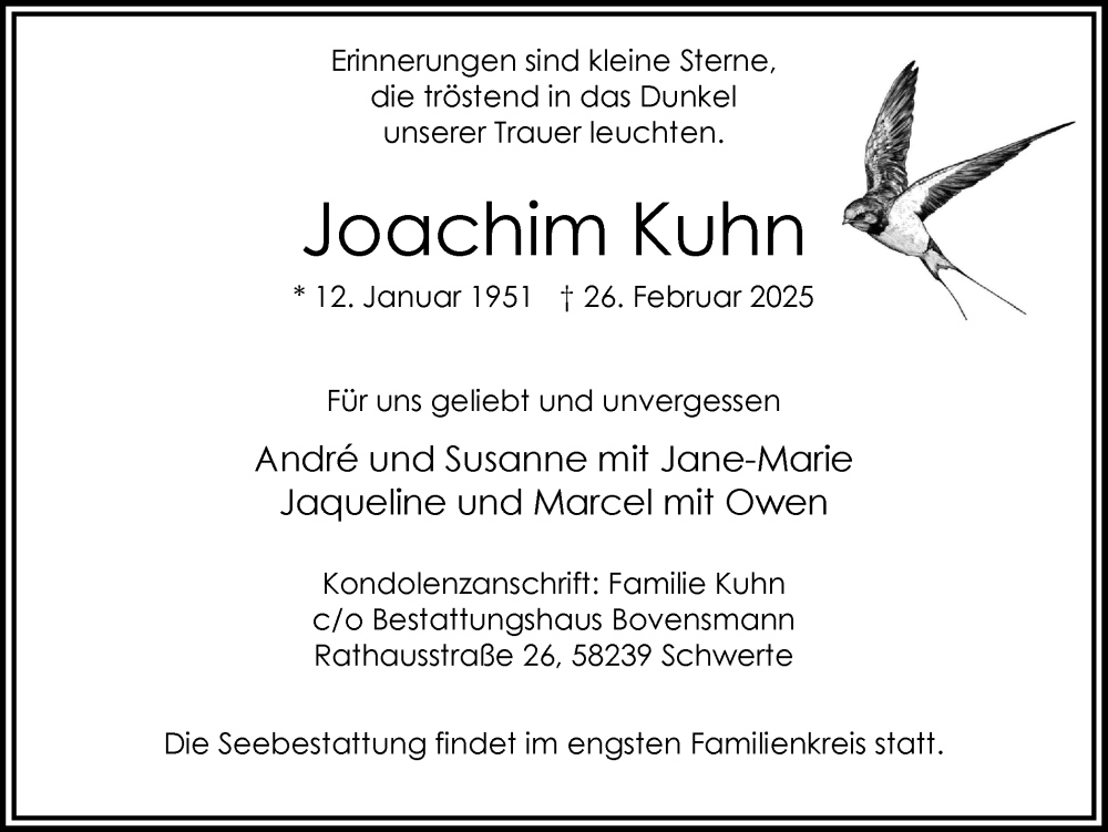Hier finden Sie alle Traueranzeigen aus der Zeitung, die bisher für Joachim Kuhn erschienen sind. Weitere Traueranzeigen, die in der Zeitung erscheinen, werden hier ebenfalls aufgelistet