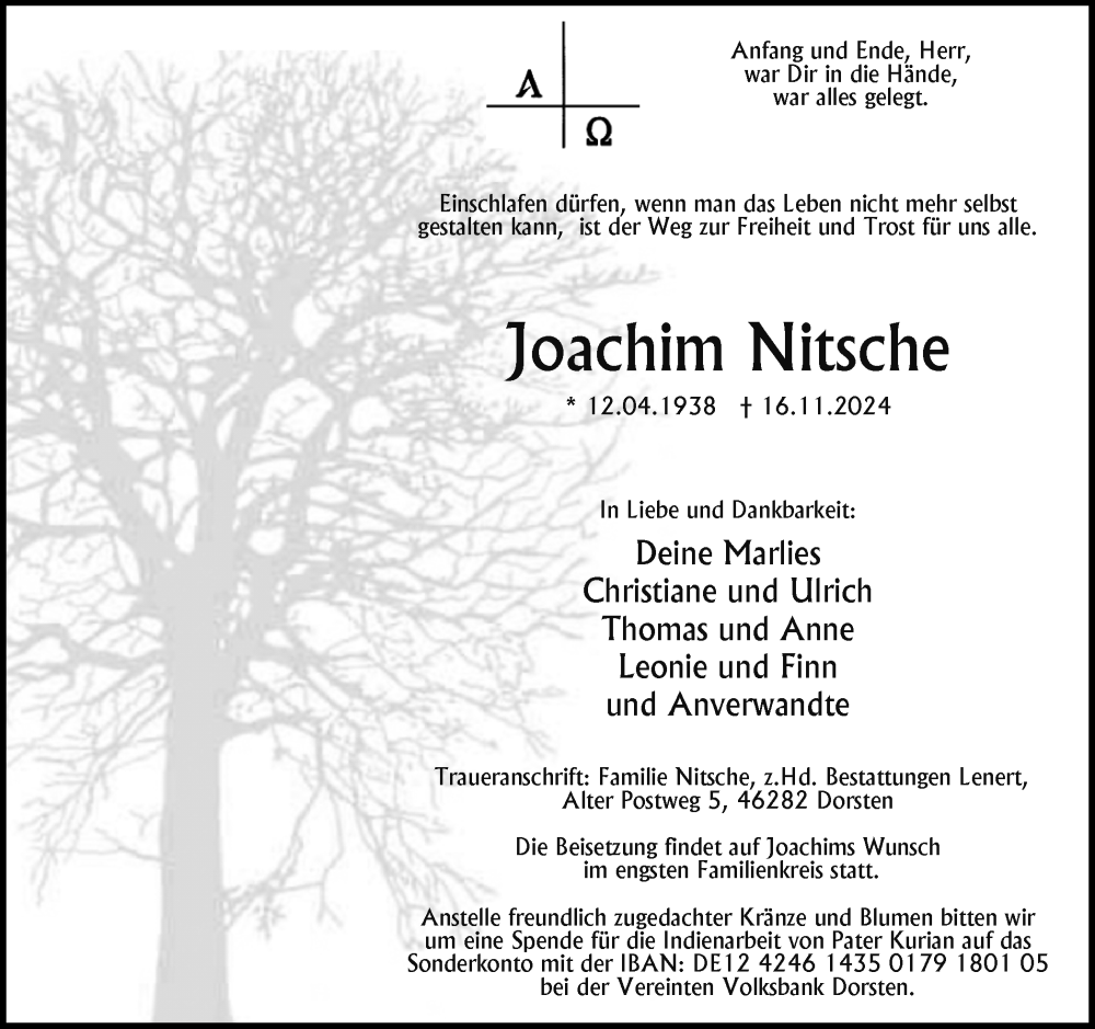 Hier finden Sie alle Traueranzeigen aus der Zeitung, die bisher für Joachim Nitsche erschienen sind. Weitere Traueranzeigen, die in der Zeitung erscheinen, werden hier ebenfalls aufgelistet
