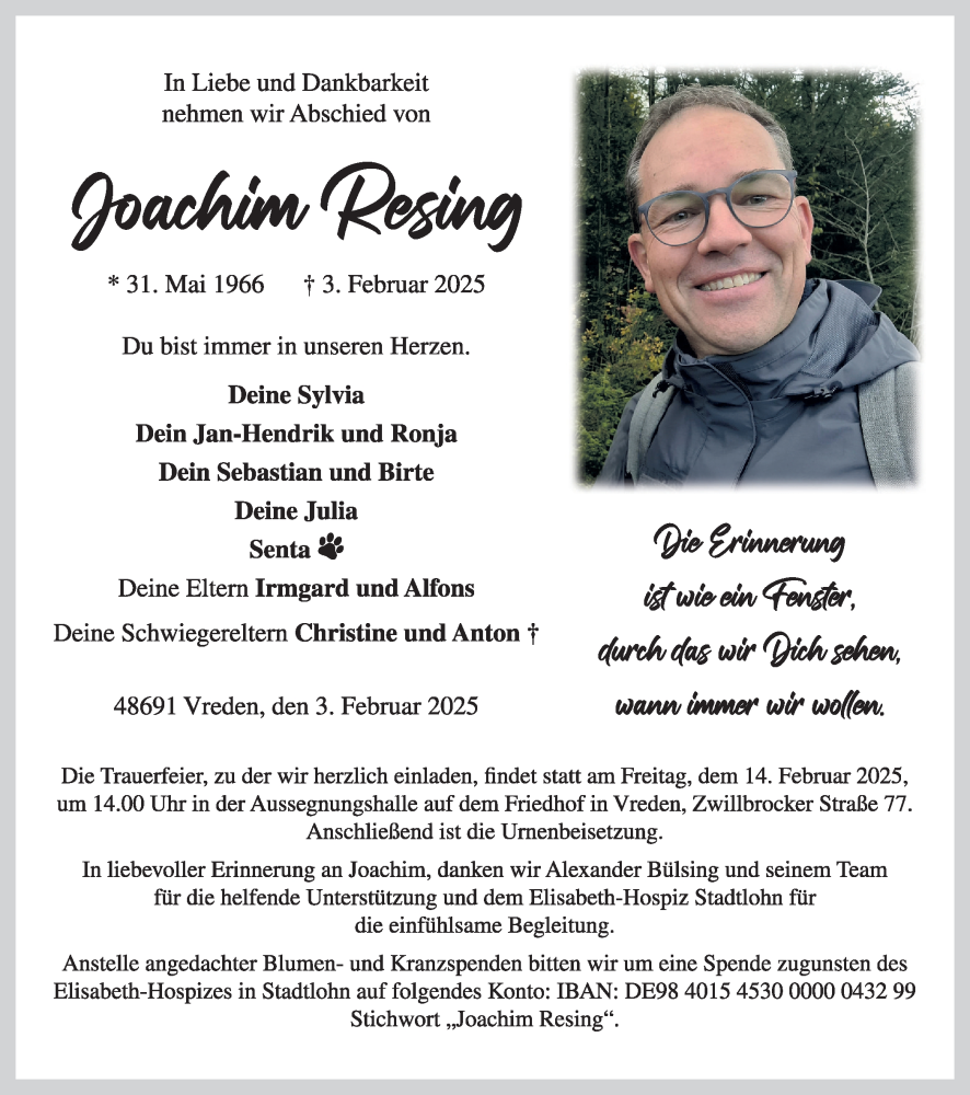 Hier finden Sie alle Traueranzeigen aus der Zeitung, die bisher für Joachim Resing erschienen sind. Weitere Traueranzeigen, die in der Zeitung erscheinen, werden hier ebenfalls aufgelistet