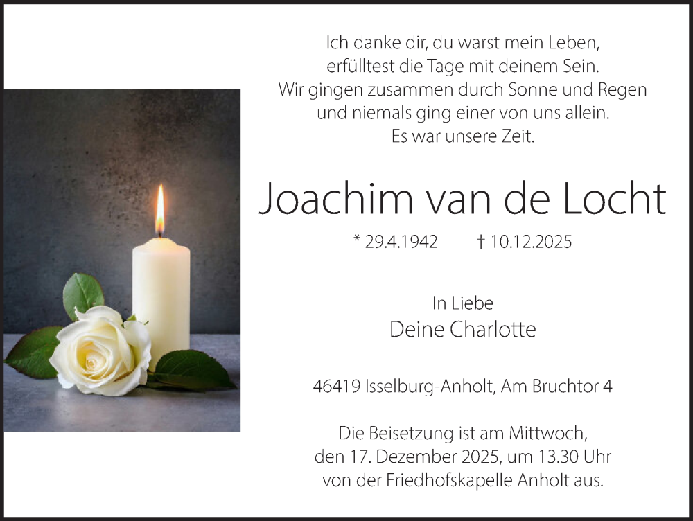 Hier finden Sie alle Traueranzeigen aus der Zeitung, die bisher für Joachim van de Locht erschienen sind. Weitere Traueranzeigen, die in der Zeitung erscheinen, werden hier ebenfalls aufgelistet
