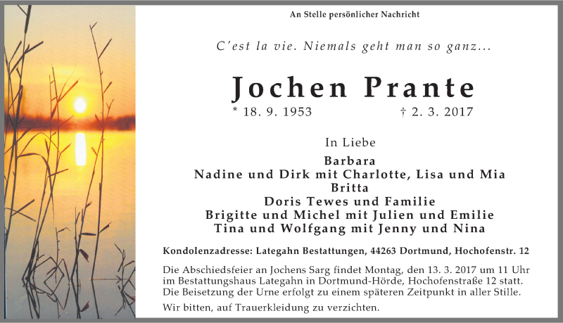 Hier finden Sie alle Traueranzeigen aus der Zeitung, die bisher für Jochen Prante erschienen sind. Weitere Traueranzeigen, die in der Zeitung erscheinen, werden hier ebenfalls aufgelistet