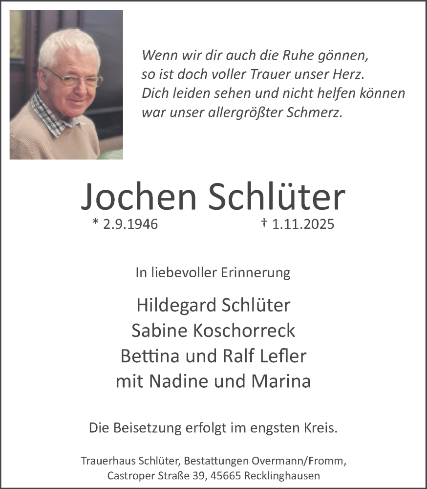 Hier finden Sie alle Traueranzeigen aus der Zeitung, die bisher für Jochen Schlüter erschienen sind. Weitere Traueranzeigen, die in der Zeitung erscheinen, werden hier ebenfalls aufgelistet
