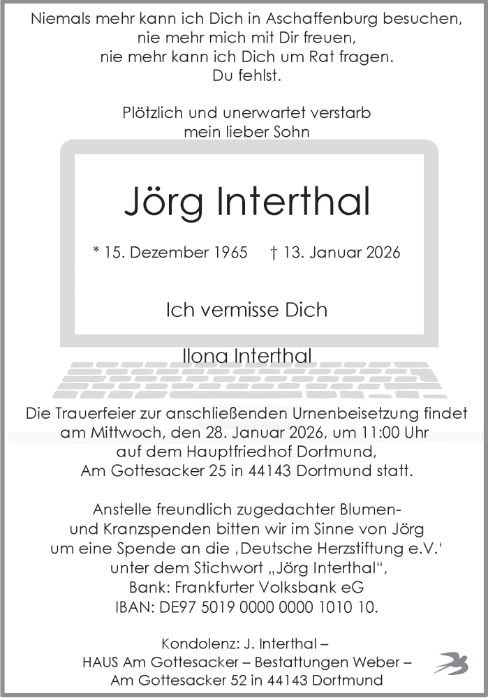 Hier finden Sie alle Traueranzeigen aus der Zeitung, die bisher für Jörg Interthal erschienen sind. Weitere Traueranzeigen, die in der Zeitung erscheinen, werden hier ebenfalls aufgelistet