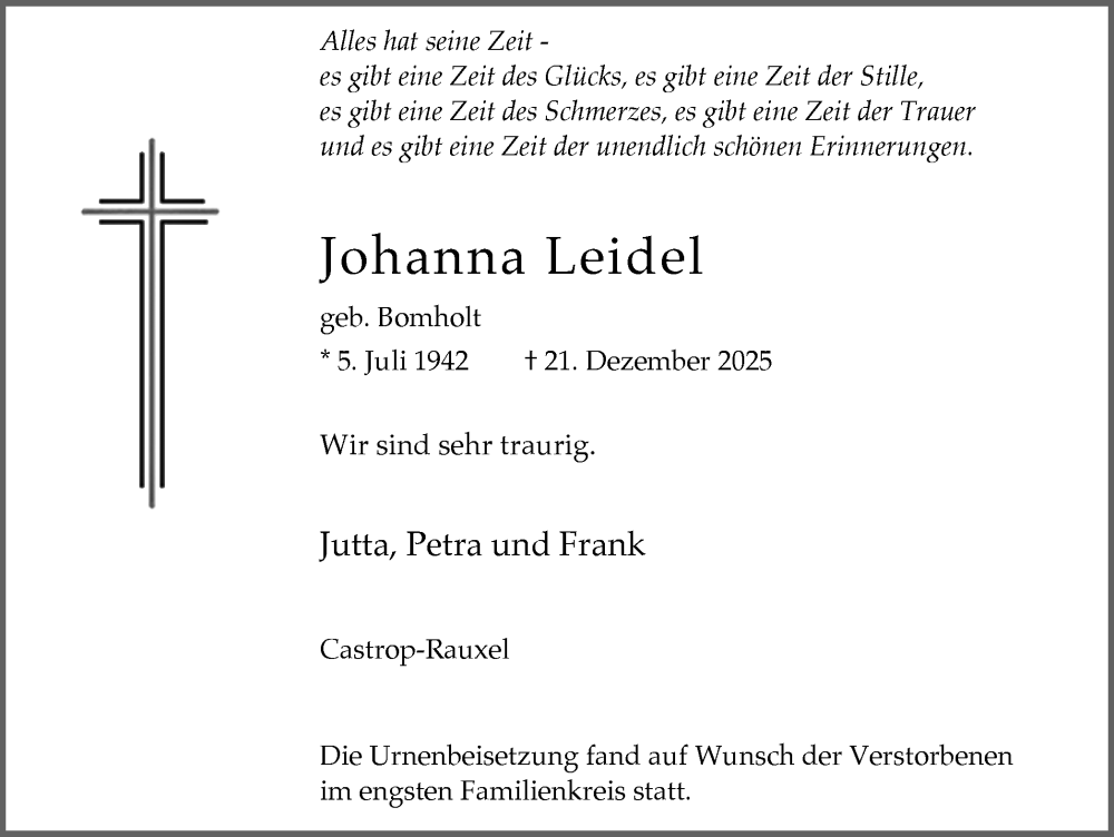 Hier finden Sie alle Traueranzeigen aus der Zeitung, die bisher für Johanna Leidel erschienen sind. Weitere Traueranzeigen, die in der Zeitung erscheinen, werden hier ebenfalls aufgelistet