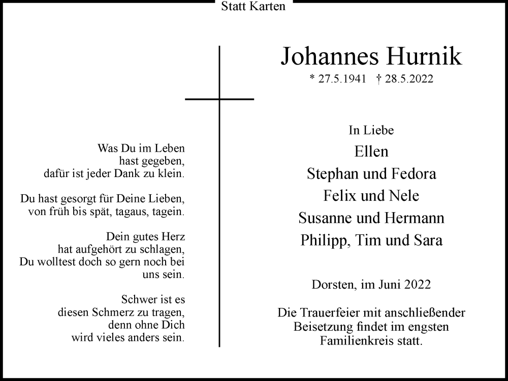 Hier finden Sie alle Traueranzeigen aus der Zeitung, die bisher für Johannes Hurnik erschienen sind. Weitere Traueranzeigen, die in der Zeitung erscheinen, werden hier ebenfalls aufgelistet