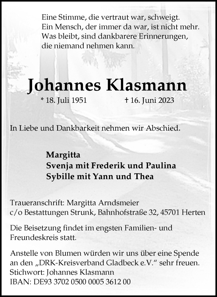 Hier finden Sie alle Traueranzeigen aus der Zeitung, die bisher für Johannes Klasmann erschienen sind. Weitere Traueranzeigen, die in der Zeitung erscheinen, werden hier ebenfalls aufgelistet