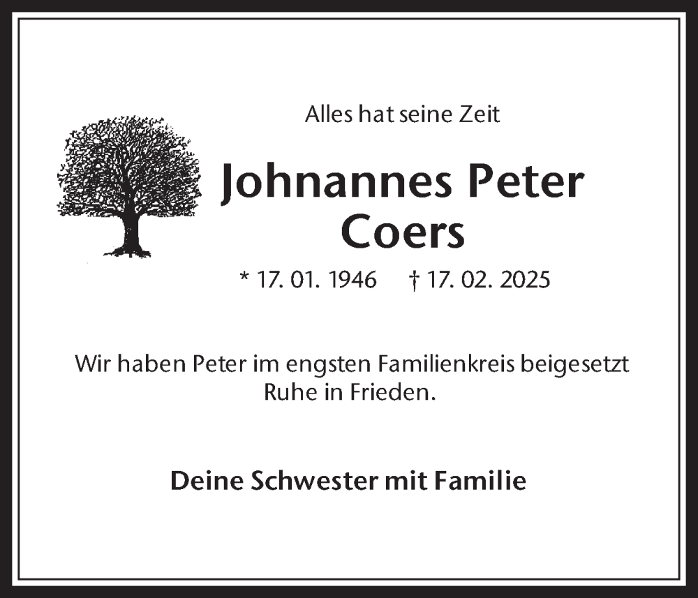 Hier finden Sie alle Traueranzeigen aus der Zeitung, die bisher für Johannes Peter Coers erschienen sind. Weitere Traueranzeigen, die in der Zeitung erscheinen, werden hier ebenfalls aufgelistet