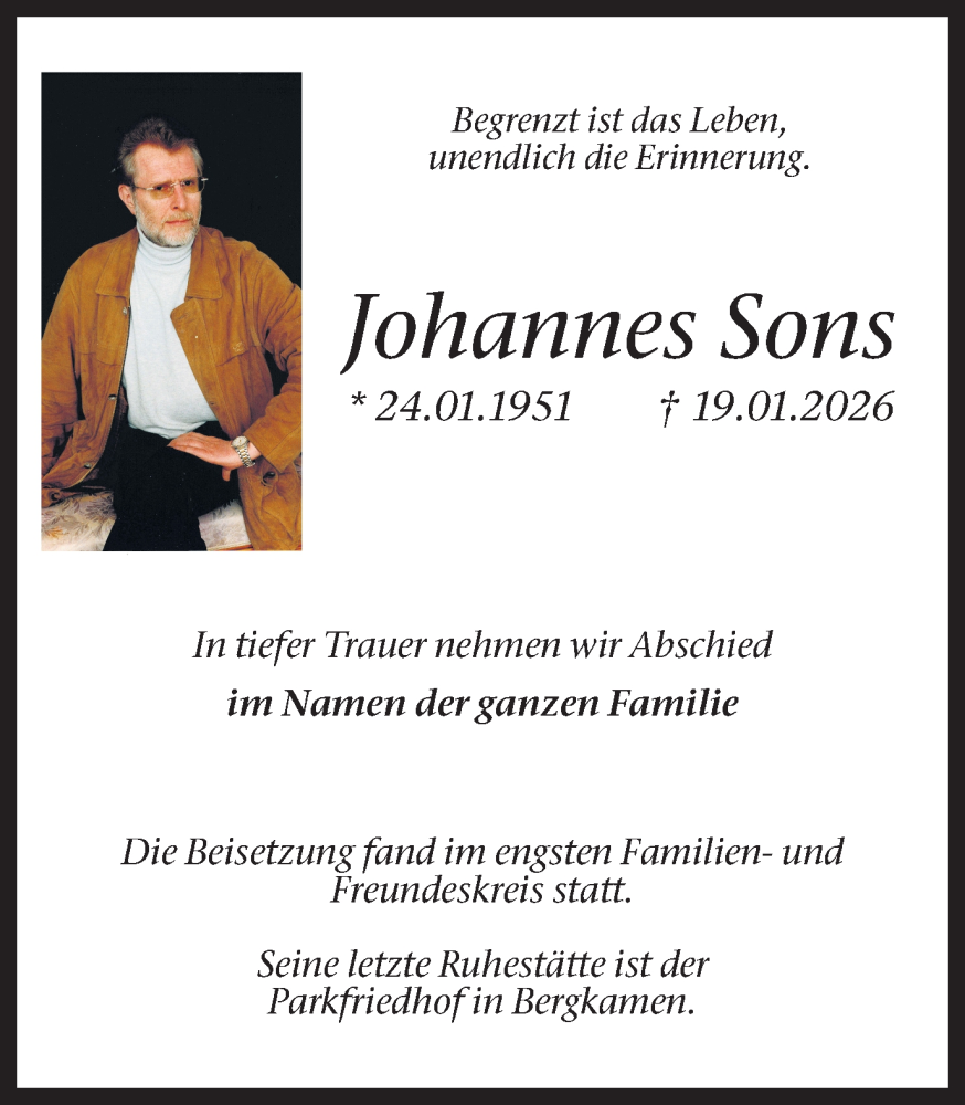 Hier finden Sie alle Traueranzeigen aus der Zeitung, die bisher für Johannes Sons erschienen sind. Weitere Traueranzeigen, die in der Zeitung erscheinen, werden hier ebenfalls aufgelistet