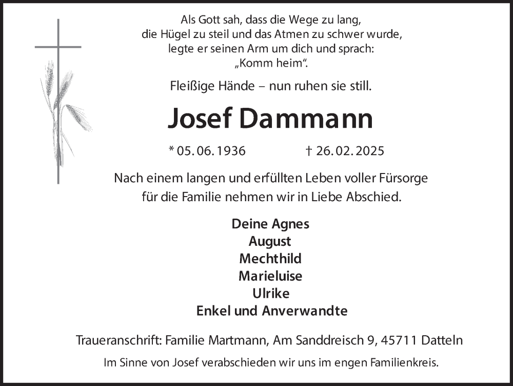 Hier finden Sie alle Traueranzeigen aus der Zeitung, die bisher für Josef Dammann erschienen sind. Weitere Traueranzeigen, die in der Zeitung erscheinen, werden hier ebenfalls aufgelistet