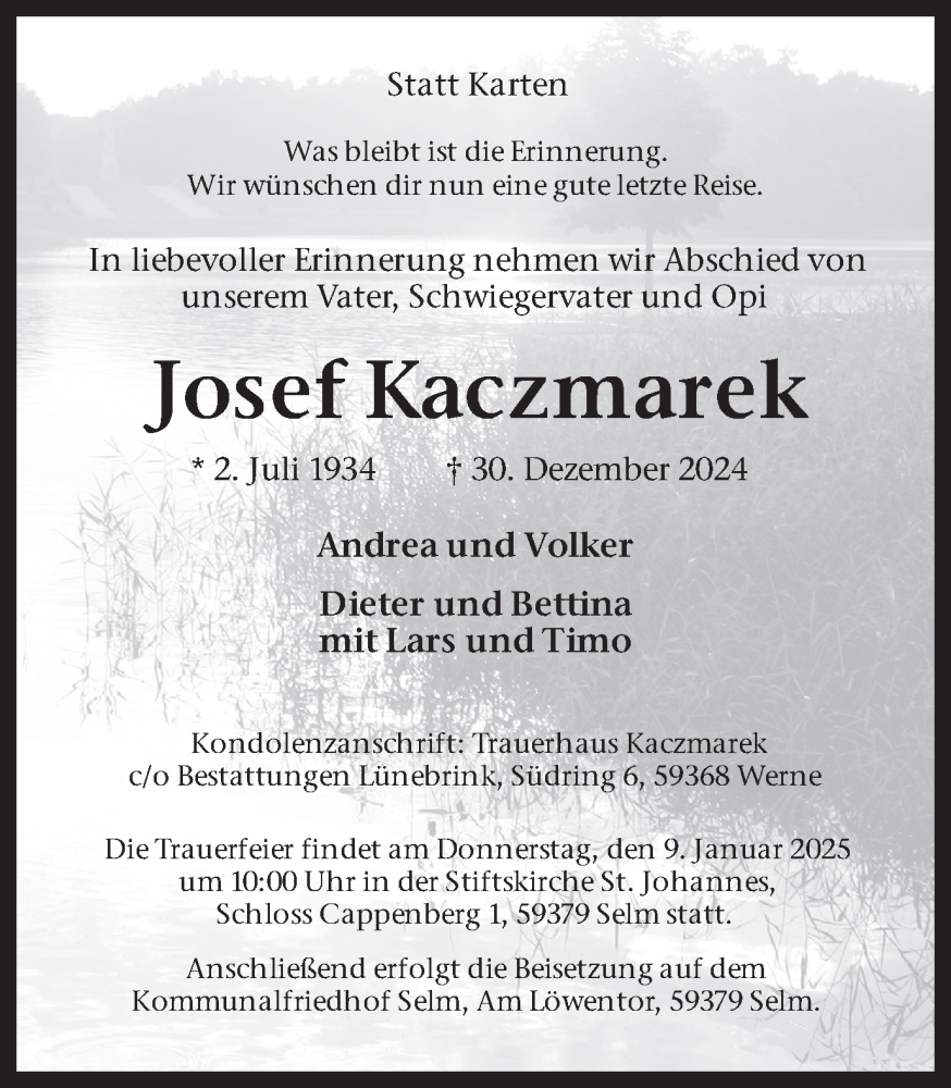 Hier finden Sie alle Traueranzeigen aus der Zeitung, die bisher für Josef Kaczmarek erschienen sind. Weitere Traueranzeigen, die in der Zeitung erscheinen, werden hier ebenfalls aufgelistet