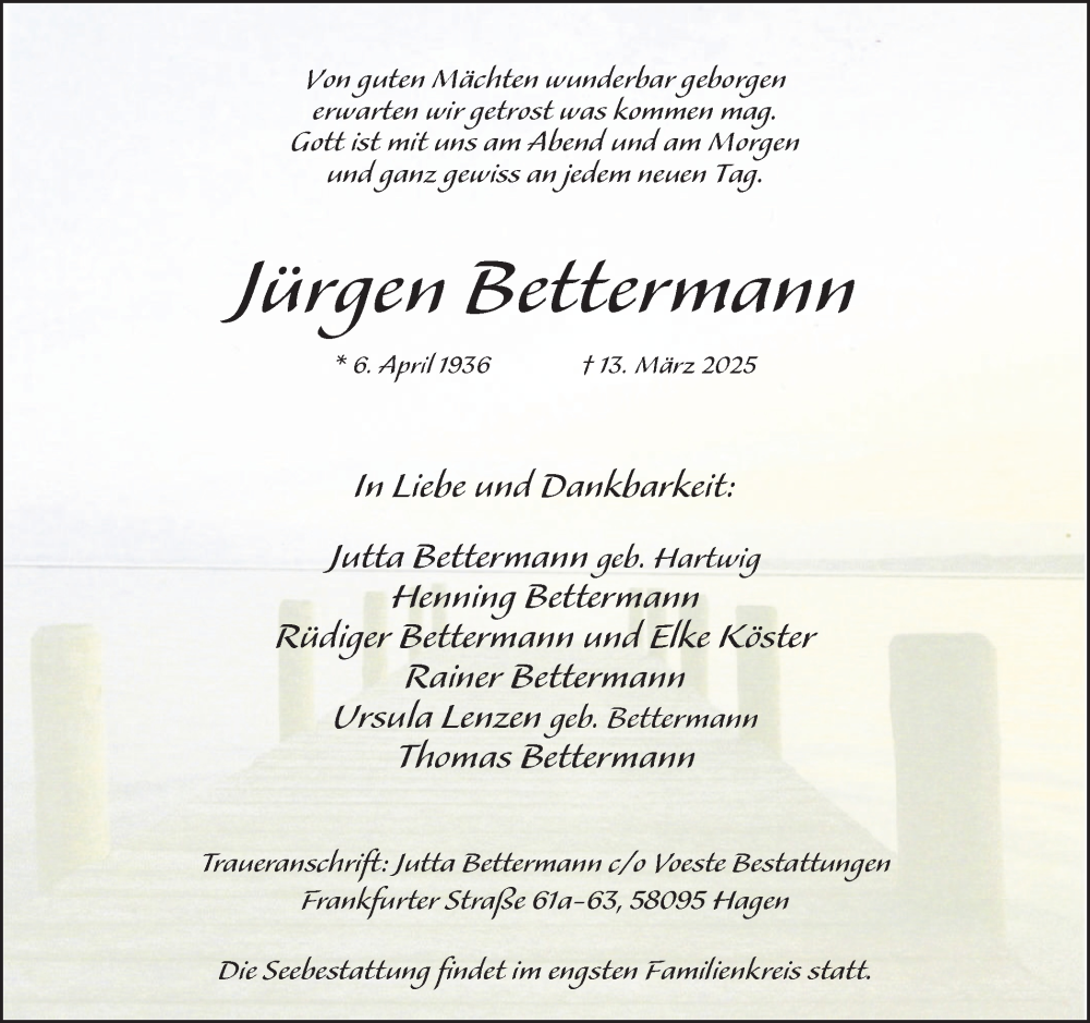Hier finden Sie alle Traueranzeigen aus der Zeitung, die bisher für Jürgen Bettermann erschienen sind. Weitere Traueranzeigen, die in der Zeitung erscheinen, werden hier ebenfalls aufgelistet