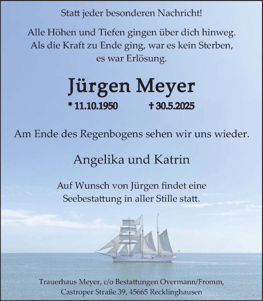 Hier finden Sie alle Traueranzeigen aus der Zeitung, die bisher für Jürgen Meyer erschienen sind. Weitere Traueranzeigen, die in der Zeitung erscheinen, werden hier ebenfalls aufgelistet
