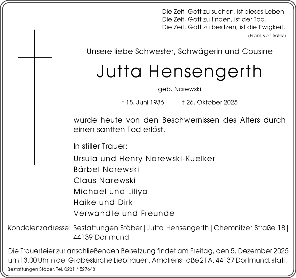 Hier finden Sie alle Traueranzeigen aus der Zeitung, die bisher für Jutta Hensengerth erschienen sind. Weitere Traueranzeigen, die in der Zeitung erscheinen, werden hier ebenfalls aufgelistet
