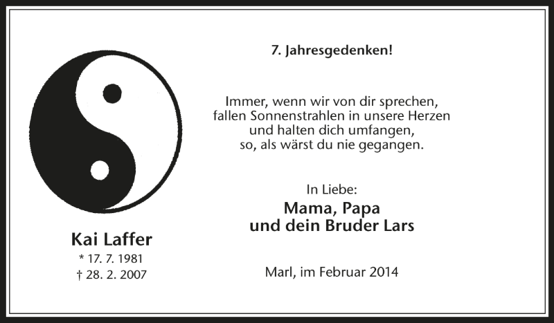 Hier finden Sie alle Traueranzeigen aus der Zeitung, die bisher für Kai Laffer erschienen sind. Weitere Traueranzeigen, die in der Zeitung erscheinen, werden hier ebenfalls aufgelistet