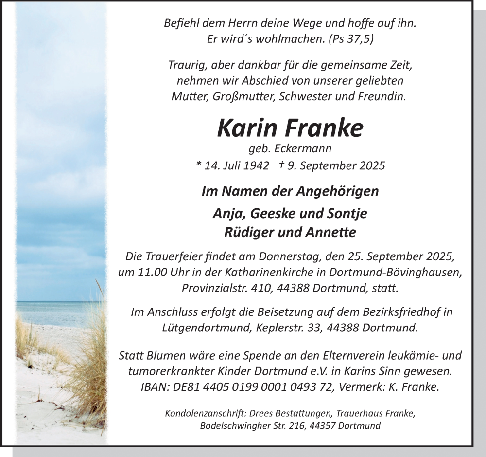 Hier finden Sie alle Traueranzeigen aus der Zeitung, die bisher für Karin Franke erschienen sind. Weitere Traueranzeigen, die in der Zeitung erscheinen, werden hier ebenfalls aufgelistet