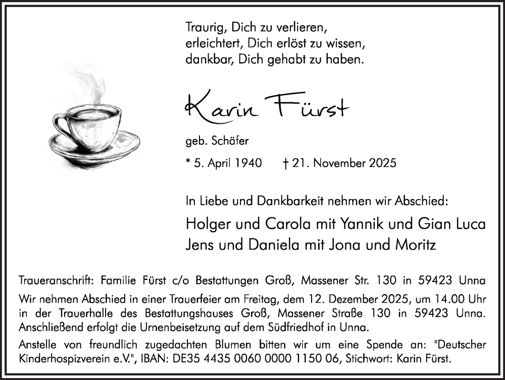 Hier finden Sie alle Traueranzeigen aus der Zeitung, die bisher für Karin Fürst erschienen sind. Weitere Traueranzeigen, die in der Zeitung erscheinen, werden hier ebenfalls aufgelistet