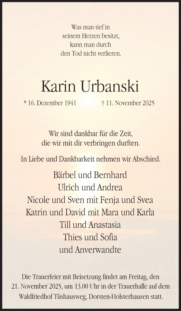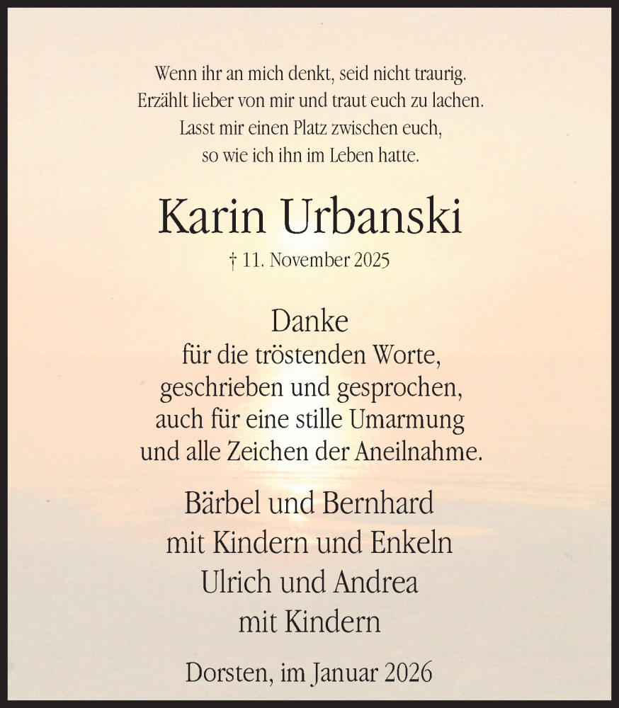 Hier finden Sie alle Traueranzeigen aus der Zeitung, die bisher für Karin Urbanski erschienen sind. Weitere Traueranzeigen, die in der Zeitung erscheinen, werden hier ebenfalls aufgelistet