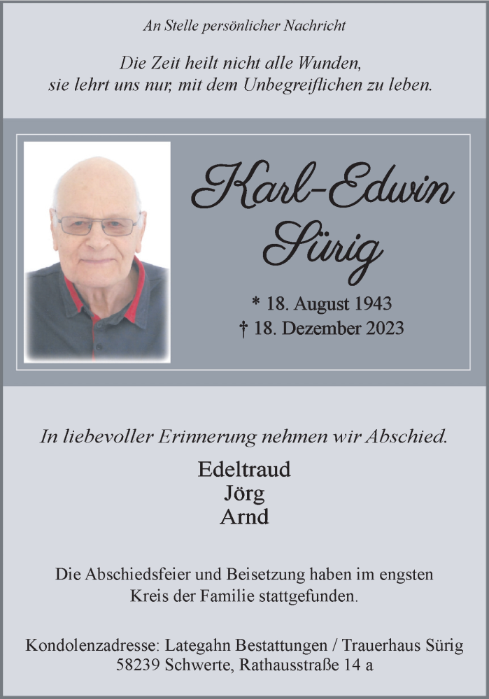 Hier finden Sie alle Traueranzeigen aus der Zeitung, die bisher für Karl-Edwin Sürig erschienen sind. Weitere Traueranzeigen, die in der Zeitung erscheinen, werden hier ebenfalls aufgelistet