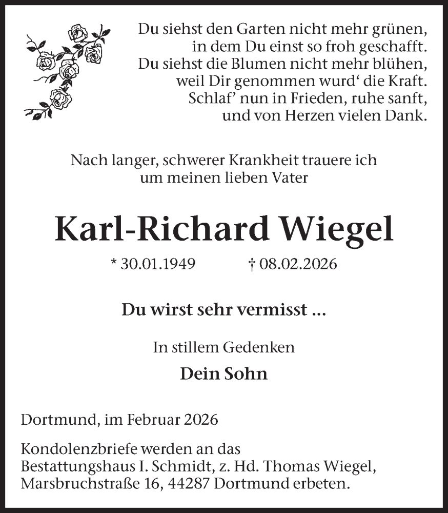Hier finden Sie alle Traueranzeigen aus der Zeitung, die bisher für Karl-Richard Wiegel erschienen sind. Weitere Traueranzeigen, die in der Zeitung erscheinen, werden hier ebenfalls aufgelistet