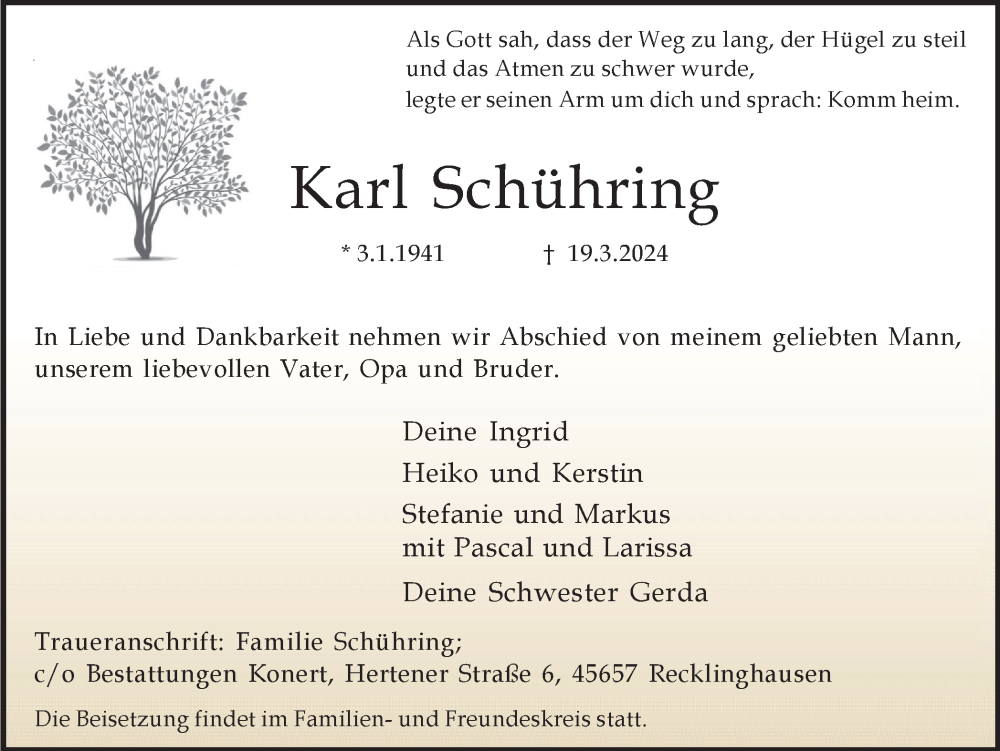 Hier finden Sie alle Traueranzeigen aus der Zeitung, die bisher für Karl Schühring erschienen sind. Weitere Traueranzeigen, die in der Zeitung erscheinen, werden hier ebenfalls aufgelistet