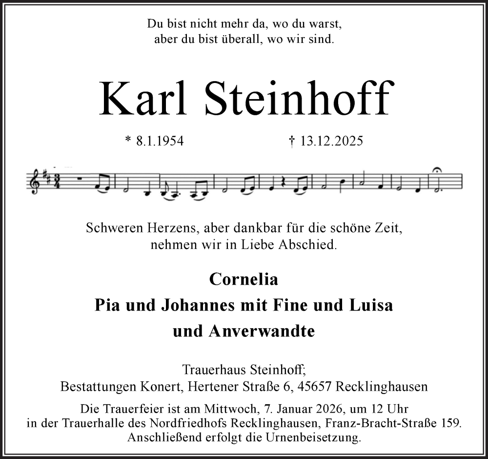 Hier finden Sie alle Traueranzeigen aus der Zeitung, die bisher für Karl Steinhoff erschienen sind. Weitere Traueranzeigen, die in der Zeitung erscheinen, werden hier ebenfalls aufgelistet