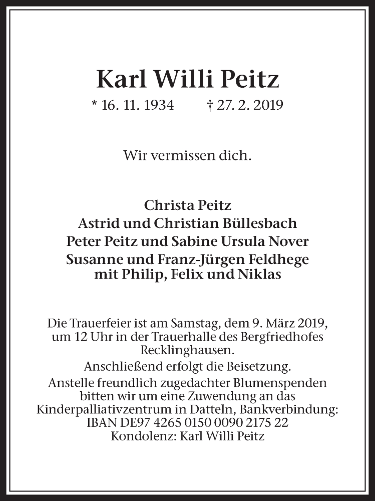 Hier finden Sie alle Traueranzeigen aus der Zeitung, die bisher für Karl Willi Peitz erschienen sind. Weitere Traueranzeigen, die in der Zeitung erscheinen, werden hier ebenfalls aufgelistet