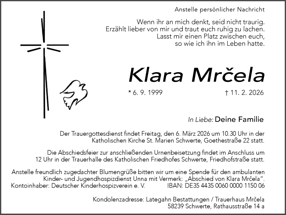 Hier finden Sie alle Traueranzeigen aus der Zeitung, die bisher für Klara Mrcela erschienen sind. Weitere Traueranzeigen, die in der Zeitung erscheinen, werden hier ebenfalls aufgelistet