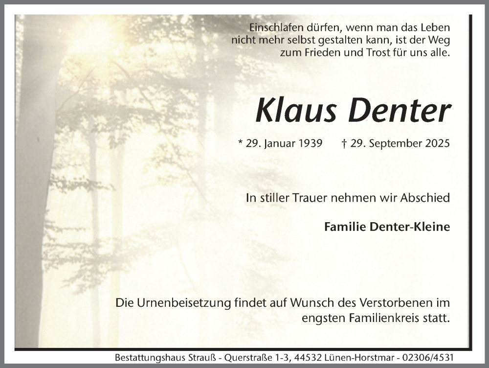Hier finden Sie alle Traueranzeigen aus der Zeitung, die bisher für Klaus Denter erschienen sind. Weitere Traueranzeigen, die in der Zeitung erscheinen, werden hier ebenfalls aufgelistet